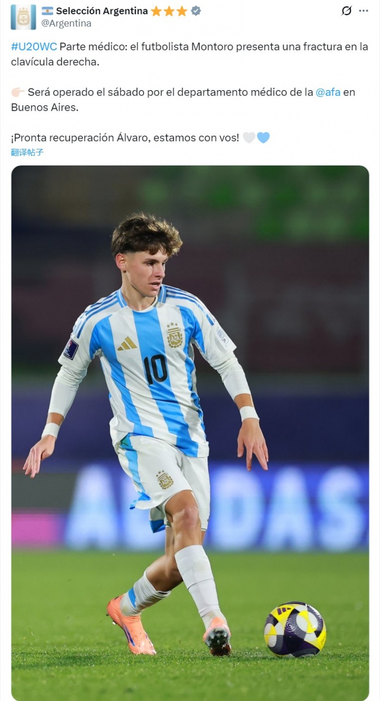 官方:阿根廷U20中场蒙托罗锁骨骨折,本周六接受手术